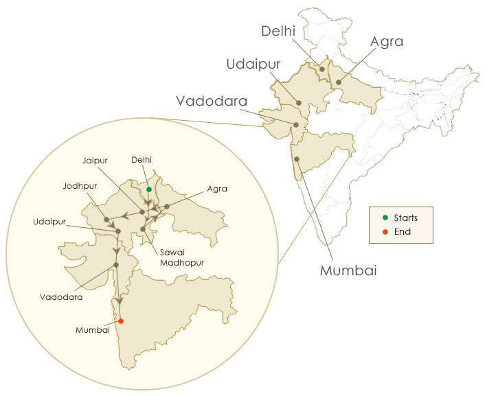New Delhi – Sawai Madhopur – Agra – Jaipur – Jodhpur – Udaipur – Vadodara – Mumbai