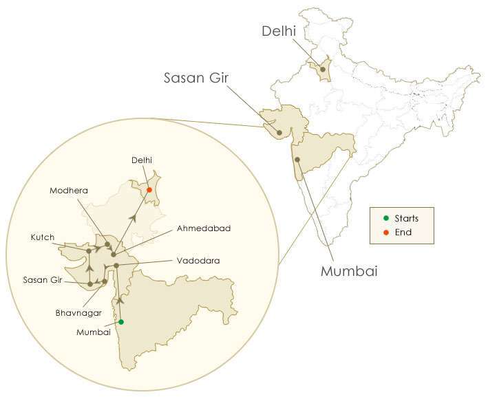 Mumbai – Vadodara – Bhavnagar – Sasan Gir – Little Rann of Kutch – Modhera – Ahmedabad – Delhi